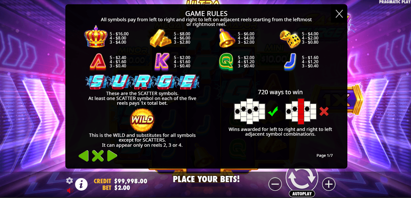 分散字母会一直持续到你拼出SURGE,启动四次免费旋转。新字母会增加旋转次数,闪电仍然可以碰撞或奖励累进度——这使得单次点击即可获得 5,000 × Ultra 奖励。在没有功能购买的情况下,耐心和资金管理是关键;许多玩家在游戏爆发前会在基础游戏中建立进步模式。